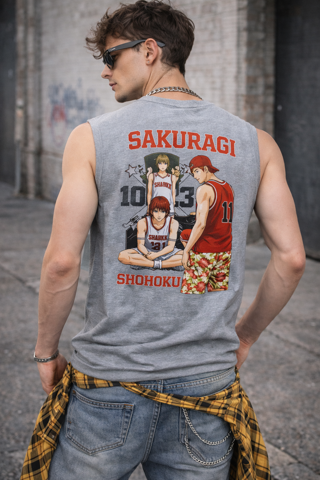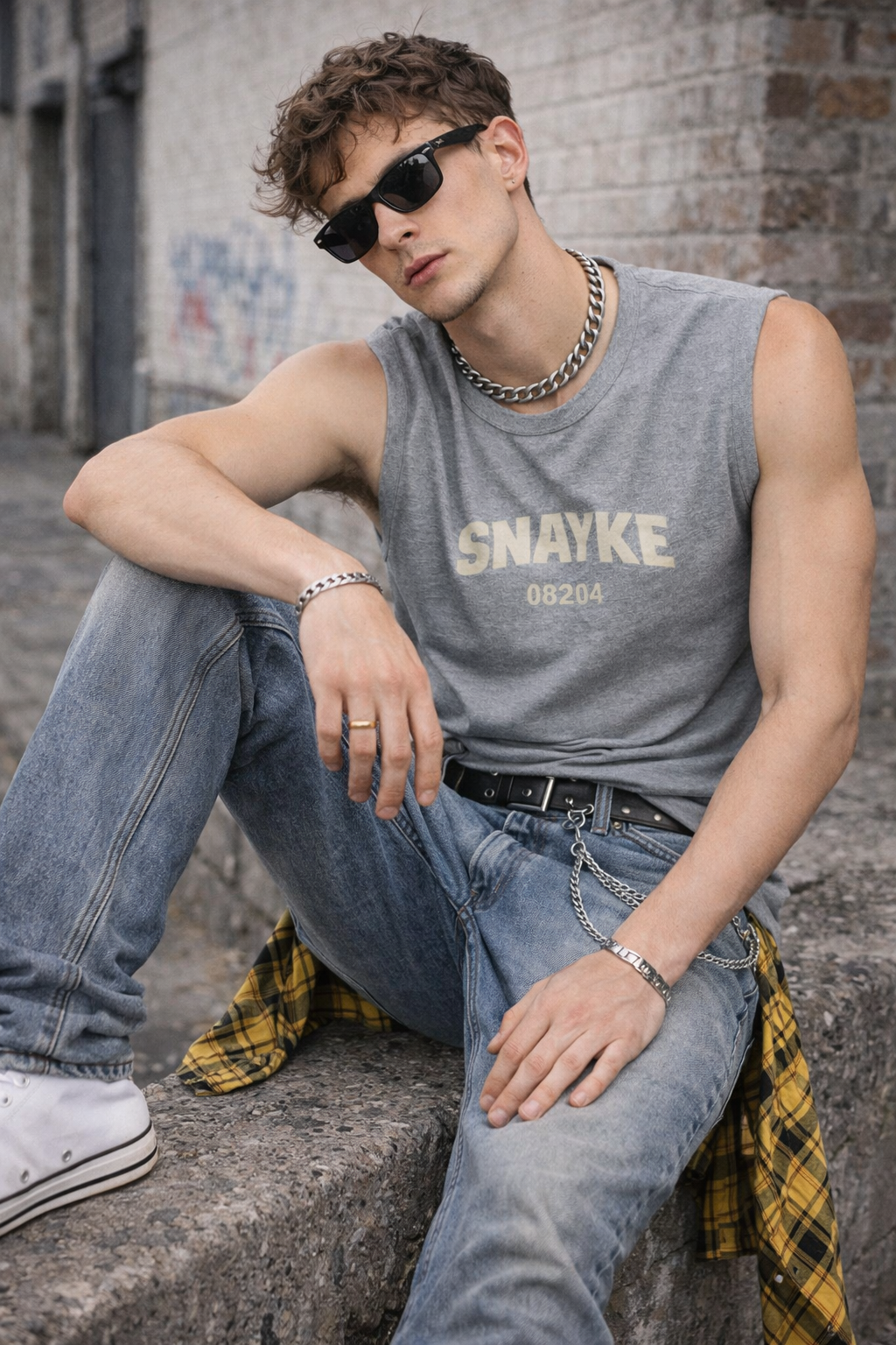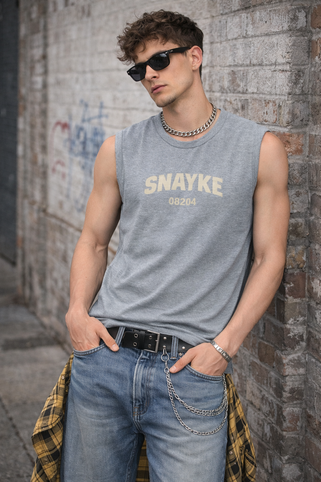 SNAYKE Men’s Sleeveless Grey Graphic T-Shirt | Anime Back Print | Regular Fit Streetwear Casual Wear